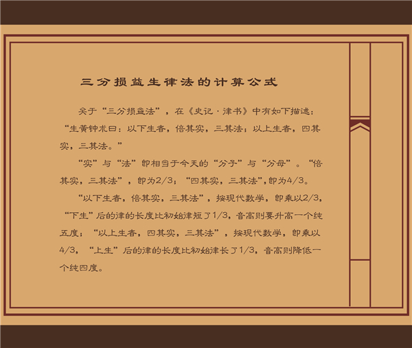 在中国古代乐律展厅,我们看到了对三分损益法的介绍。对三分损益法原理不但普通的游客不好懂,连不少专业音乐工作者也未必能达到一知半解的程度,它属于乐律学,是属于我们民族的东西。在显佑殿的中国古代音乐人物雕塑展厅中,对中国乐律学的鼻祖(黄帝时期的乐官伶伦)和明代的大音乐家朱载堉(早于西方100年的我国十二平均律的创造者)的有关介绍,会帮助我们更深一步理解中国古代乐律学的发展脉络和应用方法。展览突出强调了中国古代的乐律学也就突出强调了中华民族音乐在世界音乐史中的地位,它并非受古罗马乐律学的影响和启迪,也不是在追着西方十二平均律在跑步,它是我国独立创造并发展起来的音乐体系,形成乐律理论体系超过5000年,并深厚影响着各个历史时期的中华民族音乐。