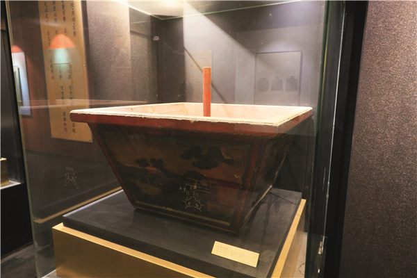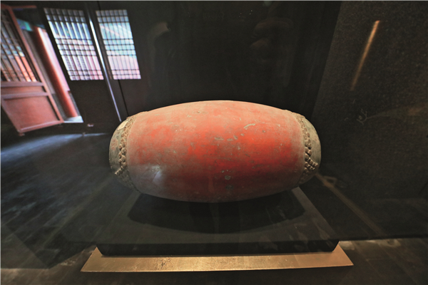 还有木制的打击乐器、铜制的打击乐器。木类的打击乐器里有舂牍,武舞生持之筑地发出声响,以节乐。柷,在中和韶乐中用于起乐,是宫廷雅乐的专用乐器,功能相当于起乐时的板鼓,但它和板鼓完全是不同的乐器,有点像四面矩形的花盆。敔也是木类打击乐器,雕刻成兽状。金属类的打击乐器就更多了,样子都很古典,名称对游客来说也很生疏。