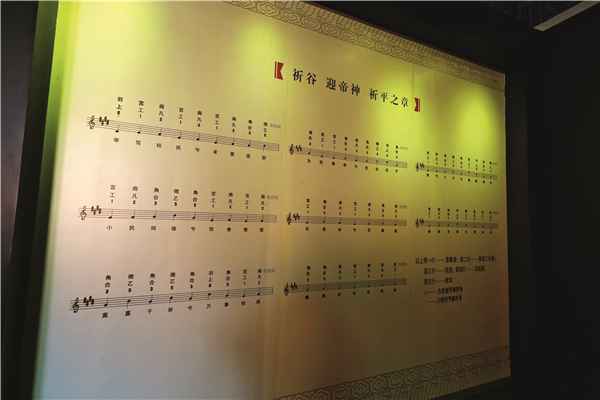 中国古代的音乐究竟起于何时?天坛神乐署的神乐之旅展中,有从约8000年前的文化遗址中出土的骨笛仿制品,它是在河南舞阳贾湖新石器时代遗址被发现的,成批地出土,数量很大。骨笛上有7个孔,体现出音阶结构,其音是有高有低的,实际上是能吹出音调吹出旋律了,说明这种乐器在当时已有比较高的音响表现力,已是成型的乐器在原始先民中使用。上古时代已有了可用乐器表达音响效果以及人的喜怒哀乐各种情绪的音乐,中国音乐的发源史至少近万年。而韶乐,文字史料中一直认定是“舜作”。韶乐也被称为舜乐。距今5000多年的历史。春秋时期的晋国史官和战国时期的魏国史官所作的编年体通史《竹书纪年》载有“有虞氏舜作《大韶》之乐。”《吕氏春秋·古乐篇》亦载“帝舜乃命质修《九韶》《六列》《六英》以明帝德。”又说这个叫质的人“乃效山林溪谷之音以作歌,乃以麋革置缶而鼓之,乃拊石击石,以象上帝玉磬之音,以致舞百兽。”像山林溪谷的歌有了,兽皮蒙的鼓有了,敲石如磬的打击乐也有了。百兽舞,应是穿着各种兽皮衣像百兽一样跳舞的人吧?