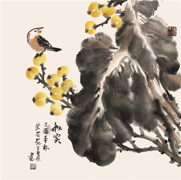 秋天,在浣花苑里不只是收获的季节,它被车晓葵赋予了更为深刻的含意。作品《秋实》,眼前的石榴已经熟透,裂开果皮露出饱满的籽粒,一只小鸟正欢快地在石榴枝头鸣唱,是为那丰硕的秋天而欢喜,还是召唤一起的伙伴?石榴在中华传承文化中有红红火火、多子多福的寓意,欢快的小鸟更烘托了这喜庆的氛围。作品《如意》也是秋天的景色,树上金黄的柿子与画作的名称构成了“事事如意”的美好寓意。柿子上的小鸟回眸一望,微张的小嘴好像正在对观者们说:“祝大家事事如意。”这两幅以秋天为主题的作品,都是画家以秋天的收获为观者送上美好的祝福。
