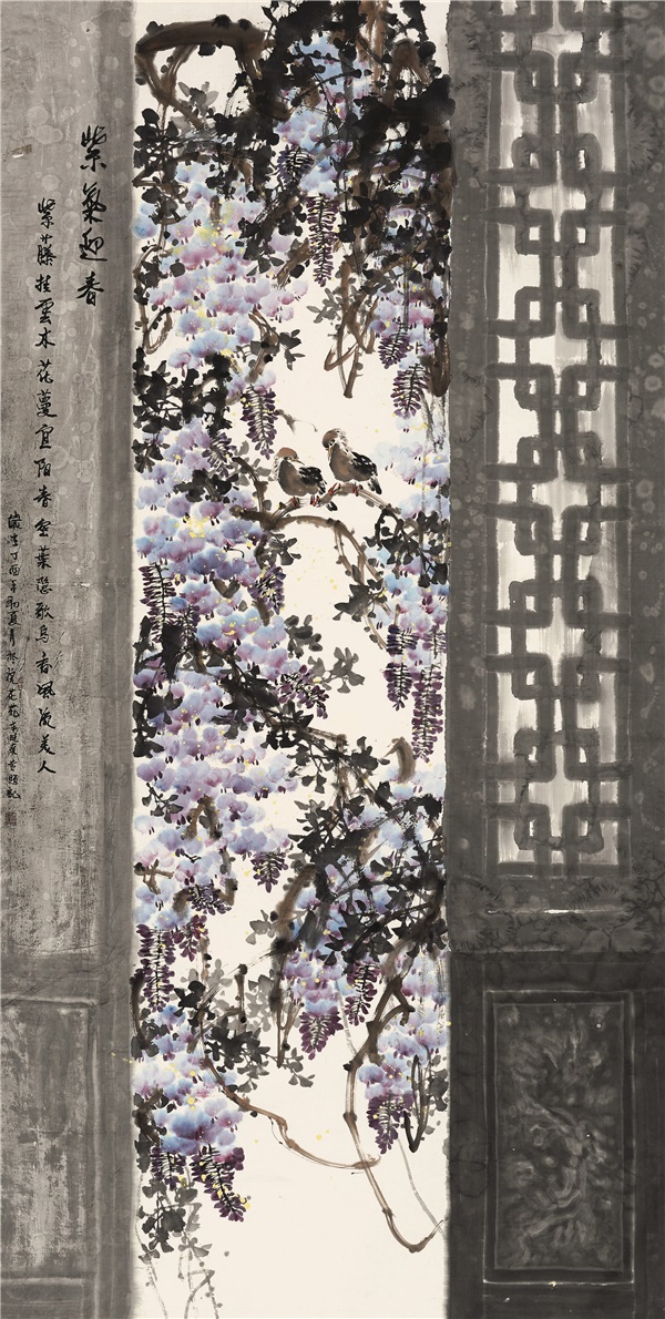 冬天在浣花园里很少出现,因为在车晓葵的心中这里永远长青,而浣花苑中对于永远长青最好的表现就是紫藤。诗仙李白有诗云:“紫藤挂云木,花蔓宜阳春。密叶隐歌鸟,香风留美人。”这也是在车晓葵《紫气迎春》上款的题字。门扉半开,满目紫藤,两只眷鸟脉脉含情,一派美丽的春天的景色。是谁推开了房门,又是谁在欣赏着这美景?是被香风留住的美人?不,那正是看画的我们,美轮美奂的紫藤好像已浸入了我们的心扉。而《紫气东来》的紫色更加浓郁,两只小鸟正齐刷刷地望向一侧,又仿佛那紫气已弥漫到了整座浣花苑之中,也弥漫在观者的身边。