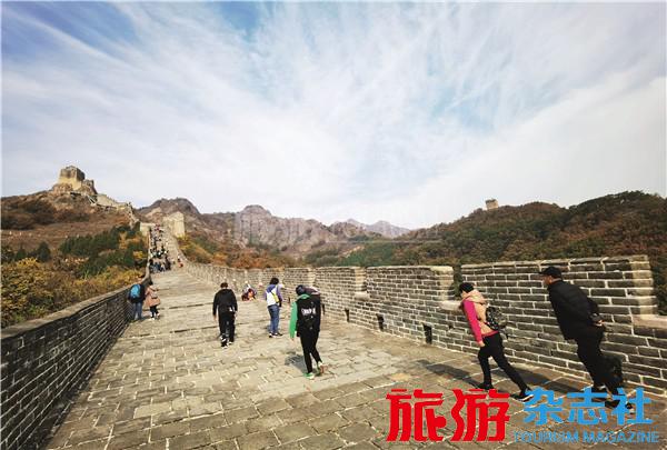来到角山脚下,看见远处山上云雾缭绕,长城沿着山势蜿蜒而上,仿佛一条长龙盘踞在山峰之间。走进“山”字形的大门,经过一段步道,沿着台阶登上长城。角山长城就地取材,依山势而建,共有敌台、战台 5 座,关隘 1 座,城墙外侧高峻,内侧低矮,便于防守作战。墙的高度宽度因地制宜变化,最矮的地方不足 1 米,最窄的地方不足 3 米。角山长城始建于明洪武年间,由大将军徐达主持修建,嘉靖、隆庆、万历年间在这里先后建设了敌台、烽火台。在长城东边的山上有一座镇虏台,上部建楼橹,周有垛口,起到瞭望放烟火通报敌情作用。作战时士兵用绳梯软梯爬上台,然后上台抽梯。台顶上石门有两根伸出石条,就是当时用软梯上人使用。
