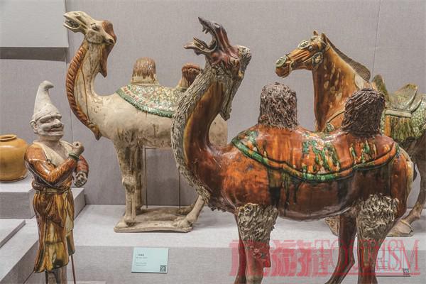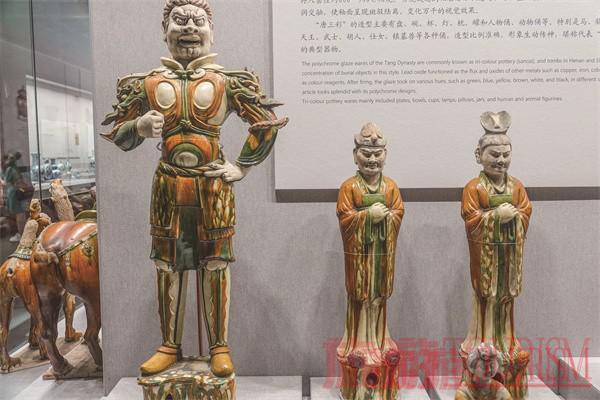 唐三彩全名唐代三彩釉陶器,器物釉色多为黄、绿、白。“三彩”是多彩的意思,并不专指三种颜色,有的器物只有一两种釉色,也有的器物上有黄、绿、白、蓝、赭、黑、紫、褐等釉色,形成绚丽多彩的艺术效果,不管颜色多、寡,只要是这种艺术风格的就统称为“唐三彩”。