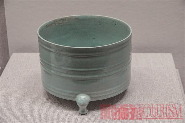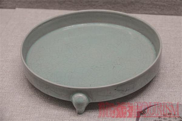 汝窑淡天青釉弦纹三足樽式炉承盘
