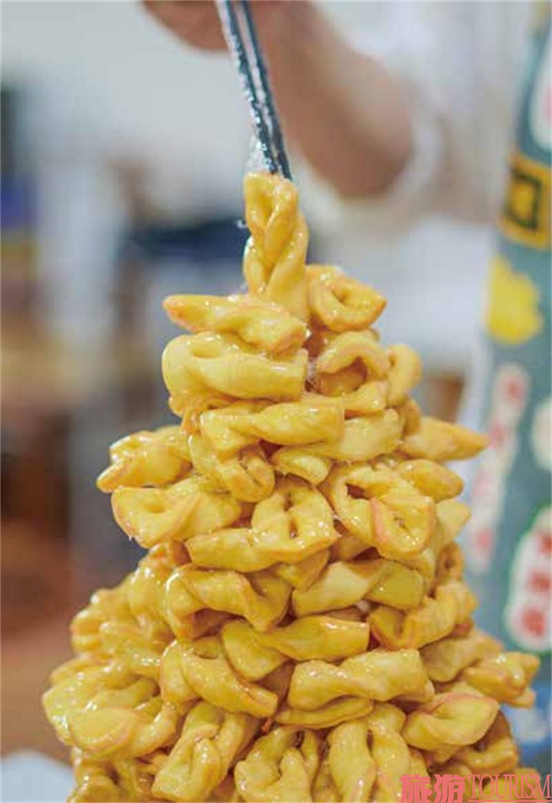 关于蜜供,其历史可以追溯至辽金或者更早。那蜜供到底是什么呢?按《光绪顺天府志》载:“蜜供,用面切细方条,长寸许,以蜜煎之,每岁暮祀神敬祖,用充供果,亦有相馈送者。”简单来说,就是用和好的面制成长方形的小条,经油炸定形并至色泽金黄后,粘蜜糖架空垒叠成塔状。蜜供作为祭祀时摆放的供品,在撤供之后就成为了人们特别是孩子们最喜爱的甜点。有时,等不到撤供,孩子们就会嘴馋,趁家长不注意时偷掰蜜供吃,也是有趣又刺激的一场童年游戏。