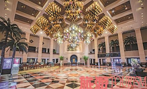 华丽的旋转门将我迎进大堂,四方堂正的空间,带来轩敞恢宏的视觉冲击。长达20余米的前台一字排开,尽显秩序感,点缀其间的当代艺术作品,又为空间增添了多元新意。二层回廊环绕,360度连续延展的廊柱下立着16根高耸方柱,廊间茂绿的芭蕉增添了生机;四面敞开的高台上,馨园咖啡厅兼具复古与时尚感。