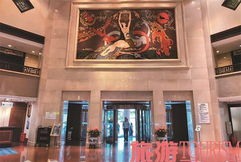 抬头望去,主楼迎面正上方悬挂巨幅山水画《爱我河山》,这是“长安画派”巨匠何海霞的力作,21平方米的画幅与大堂空间完美契合,大气磅礴、熠熠生辉,堪称“镇店之宝”。我曾多次默立观赏,而今画中苍茫厚重、浓淡相宜的笔墨虽已漫出褶皱,但笔墨间蕴含的对祖国山河的真挚热爱,仍在延伸沉淀。与其相对的,是大堂门楣上方的景泰蓝泊晶工艺画《女娲补天》。两幅画作遥相呼应,悄然为往来宾客解锁着这座宝藏饭店的生命力密码。