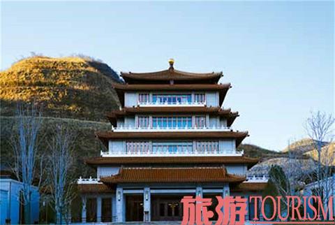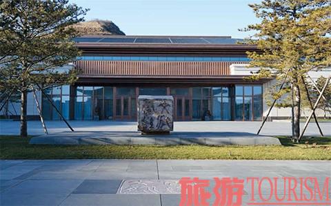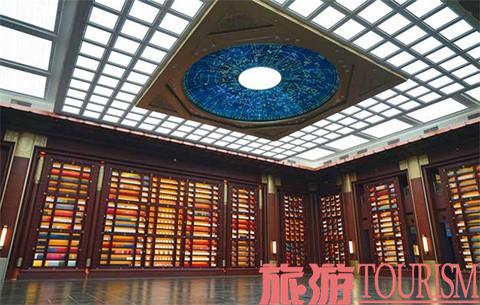西侧的兰台洞库嵌入山体,由天然山体经过开凿改造而成,专门用于保藏古籍版本。洞库有10余个独立库存,其中1号洞库收藏汉、蒙古、藏、满4种文字的《大藏经》雕版,用上等梨木与红桦木制成。2号洞库藏有文渊阁、文溯阁、文津阁、文澜阁四阁真本和《四库全书》,首次展现了“四阁四库”合璧。这些古籍、雕版静静立在书柜上,历经数百年风雨变迁,但依然熠熠生辉,甚至可以隐约闻到幽幽的墨香及木香。抬头仰视顶端,飞天壁画为洞库添色不少,它采用的是敦煌双飞天对舞造型与双凤衔花卷草纹图案,飞天的舞者手持各式各样的乐器,飘逸灵动,其四周的天花流光溢彩,颇有东方美学的浪漫。