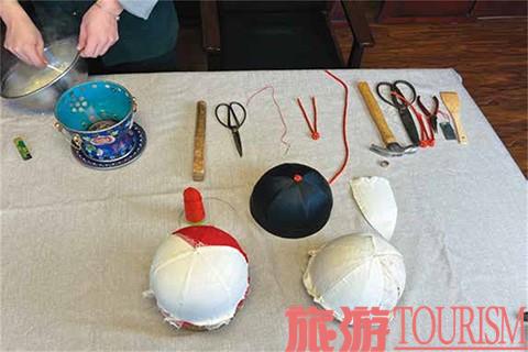 制作工具并不复杂,量布匹的尺子、针头线脑外加顶针都是寻常之物。敦实的帽盔,顾名思义是制帽布料的定型、加工“平台”,红色盘扣线让人想到了曾经官帽上的红色缨子,设计巧妙的弯尺规划出帽圈的柔美弧线,烙铁则“热力四射”,为帽子定形。制作马聚源的民族帽子还会用到锥子、钳子、锁边机、钉锤、拉皮刀等工具。