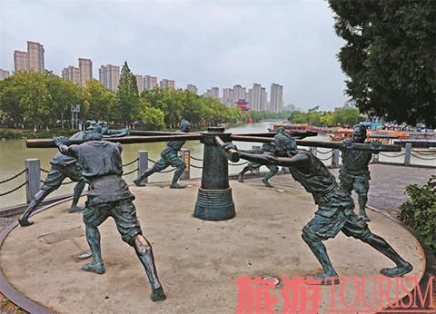 站在闸桥上,极目远眺,运河两岸的景色尽收眼底。在清江大闸畔,有一组名为《绞关》的雕塑,逼真地模拟了清江大闸的运作。每一次升降清江大闸,都需要6名闸夫同时推动巨大的绞盘,闸夫们光着膀子,肌肉绷得像铁块,正在奋力地转动绞盘,脸上的表情专注而坚定。遥想当年,每当运粮季节,万艘漕船“帆樯衔尾,绵亘数里”,闸门缓缓开启,漕工们喊着响亮的号子,齐心协力地拉动船只,那壮观的场景仿佛就在眼前……