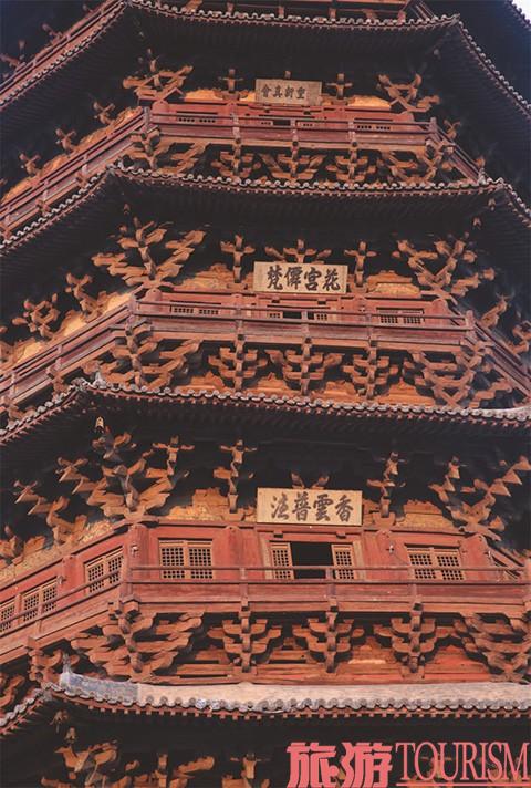 远观或是近看,木塔不仅构架宏伟,坐落稳重,而且造型完美,技艺精巧,有极好的整体性。如此庞然大物,大小部件若干,却没用一个铁钉子,全部靠着斗拱柱梁镶嵌穿插吻合。木塔每层檐下及暗层平座围栏之下,都是一组挨一组的斗拱,转角外更是三组斗拱组合在一起,犹如朵朵盛开的硕大莲花。木塔共使用54种240组不同形式的斗拱,种类之多,国内罕见,也是我国古代建筑中使用斗拱最多的塔,堪称“斗拱博物馆”……
