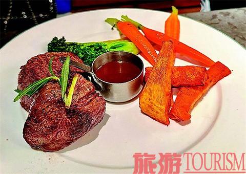 最先登场的是菲力牛排,这道菜可以说是各类西餐厅的常客,评价牛排好不好吃,主要在于肉质、火候和调味。因菲力牛排普遍偏厚,且脂肪较少,所以对厨师的要求较高,稍不留神就有可能煎老或夹生。服务员刚把牛排端上桌,我就被强烈的黑胡椒和牛肉的香气吸引,煎制的火候极其到位,牛排表面覆有一层淡淡的焦化层,是美拉德反应的完美结果。用筷子轻轻一戳,内里柔软,触感细腻,这便是七分熟度。用刀叉轻轻切开,内里透露着粉嫩的颜色,经过排酸的肉没有一点牛肉的血沫味儿,吃进嘴里质感十足,极其扎实。调味上采取了经典的西式思路,黄油、迷迭香、黑胡椒和海盐融合在一起,馥郁、美妙又迷人。配菜颇有心思,搭配了手指胡萝卜、红薯条和西蓝花,同时佐以一小碟黑椒酱,为口味重的顾客提供多一重选择。