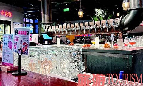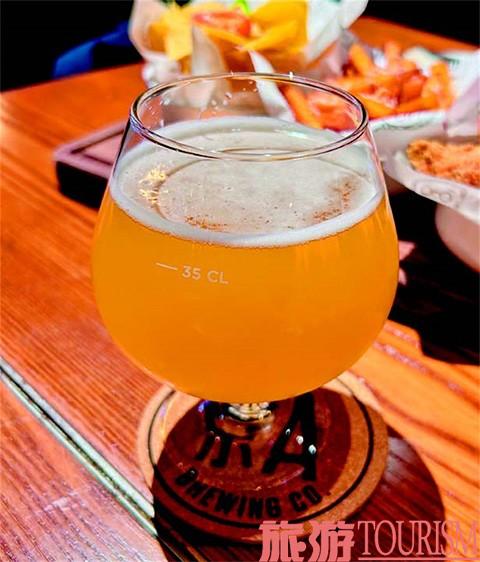 京A的名字来自汽车号牌,是北京最早发放、最稀缺的号牌。Taproom,Tap意为“水龙头”(酒头),也就指代以桶装酒(啤酒)为主的店。一进大门,映入眼帘的是一个硕大的环绕型吧台,整齐地陈放着一列酒头。在吧台的最上方,用细横木牌陈列着各式酒水的名目和价格。店内的灯光柔和,色调偏暖,亮度偏暗,与门外商场的风格截然不同。周围几面墙做成了红砖堆叠的造型,有一种“废土”气息,让人仿佛置身于一个神秘的乐园,那一瞬间,让人不自觉地联想起美国乡村的俱乐部。我们到达时夜幕早已降临,店内时而舒缓、时而高亢的摇滚乐在撩拨我们的耳膜,还未就座,就已被氛围深深吸引。