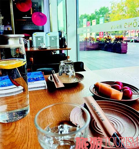 我们选择在靠墙处就座,墙面纹理如起伏的沙滩,流动着胶东沿海地区的灵动气韵,暖黄灯光铺洒下来,为每张餐桌都染上一片温馨。棕黄皮质长凳质感细腻,与原木色餐桌搭配,质朴中见精致。餐具摆放齐整,静候客人开启一场与胶东美味的邂逅。这些装饰着实带给我一份悠闲自在的舒适感。临近商场的玻璃窗上贴满了红彤彤的苹果图片,既醒目又亲切,能感受到老板对于家乡风物的热爱。