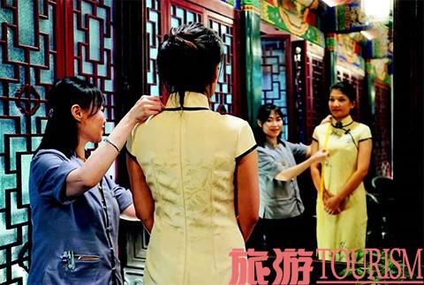 第五代传承人汪超介绍,瑞蚨祥中式服装制作中讲究“四功”,即刀功、车功、手功、烫功,“九势”,即胁势、胖势、窝势、戤势、凹势、翘势、省(sǎng)势、圆势、弯势。一件完美的旗袍符合16个标准:平、服、顺、直、圆、登、挺、满、薄、松、匀、软、活、轻、窝、戤。