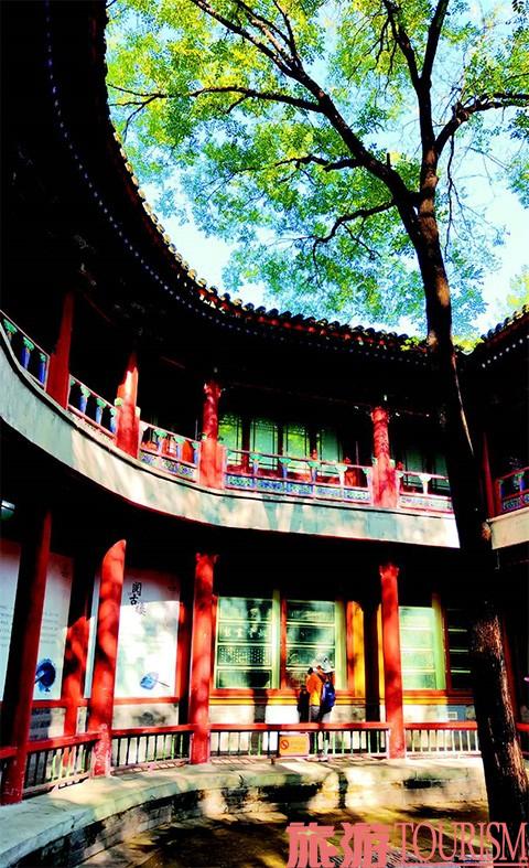 阅古楼中心是一座半圆形天井,站在中间,看到的是一座两层带回廊的围楼,上下各有25间,但实际上它的结构更接近南方吊脚楼,建筑西面弧形的部分是两层,东面方形的部分是一层,地基直接架在山坡上。讲解员说,清代时阅古楼内侧回廊并不开窗,东侧方形外廊上下各分为11间,上层每间镶嵌石刻21方,共镶嵌231方;下层每间镶嵌24方,共镶嵌264方。阅古楼二层临湖一面设有格栅窗,正对波光浩渺的太液池;对山一侧设有推扇门,前面平台上建有烟云尽态亭,格栅敞开后可以坐看山景,湖光山色尽收一楼。