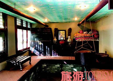 继续向上,我来到三进院“议事厅”。抬首迎面便是“义重感骖”的匾额,两边对联为“仁结八方宾客,义聚四海英雄”,倍觉正义凛然。正厅是接待贵宾和大宗客户的场所,室内雕梁画栋,绫罗绸缎装饰。客厅正面挂着达摩祖师的画像,除了因其在武术界的崇高地位而成为镖局的精神象征之外,张震远练的正是形意拳,故供奉达摩亦有溯源之意。画像两侧为李鸿章的题词对联“一身悍武镖车走,连年江湖平安回”。镖师们每日都过着刀上舔血的生活,“平安”便是他们最朴素的愿望。左右厢房为镖师卧室,面积较大的是总镖头房,家具精美大气,其他镖师卧室面积较小,陈设简单朴素。
