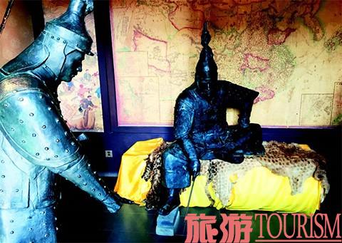 八旗会馆为二进院建筑。门前可以看到雕刻的二龙壁吉祥图案,大门牌匾写着“承先启后”,两对上马石和拴马桩彰显了八旗子弟的地位。一进院中间树立着八面旗帜,代表着清太祖努尔哈赤创建的八旗制度,回廊的壁画记载着八旗的文化、历史、信仰以及饮食文化等知识,细细看遍,趣味无穷。回廊两侧分别是会客厅和军机处,军机处内展示了康熙帝骑马铜像,以及从清太祖努尔哈赤到宣统帝溥仪共12位皇帝的画像和简介。正厅中军堂的3尊铜像吸引了我的视线。只见努尔哈赤不怒自威,坐在一张豹皮上,脚踩青砖,与手下将领共同商讨部署着萨尔浒之战。萨尔浒之战是1619年努尔哈赤率领的后金军和明军在萨尔浒山进行的一场大战,后金军一战成名。遥想当年的战争场面,该是怎样的激烈和悲壮?