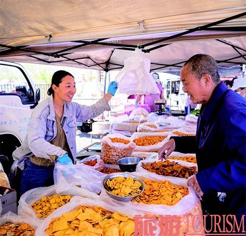 顺着香味走入集市深处,是一个更为缤纷的世界。商铺鳞次栉比、摊位琳琅满目。本地农户带来的时令货品随着季节变换。春天,香椿、菠菜鲜嫩得能掐出水来;秋天,苹果、核桃堆得像小山一样;农户自己晾的葫芦条、松蘑干串成串,散发着山野味道。