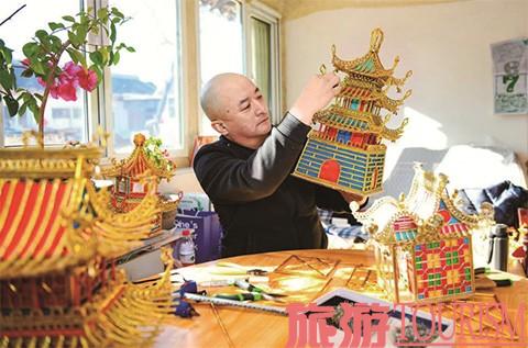 永宁镇西关村的胡同深处,青砖灰瓦间藏着一座不起眼的院落。推开木门,高粱秆的清香混着绸布的柔润扑面而来,这是非遗传承人时金亮的工作室,也是延庆戏楼灯笼的“焕新之地”。51岁的时金亮正坐在炕沿边,指尖翻飞间,几根比铅笔略细的高粱秆已缠上金粉纸,扎出方正的框架。阳光透过窗棂落在他手边,照见那些等待组装的“微型戏楼”:飞檐翘角、彩绸帷幕、鎏金梁柱,俨然是明永宁镇西关村的胡同深处,青砖灰瓦间藏着一座不起眼的院落。推开木门,高粱秆的清香混着绸布的柔润扑面而来,这是非遗传承人时金亮的工作室,也是延庆戏楼灯笼的“焕新之地”。51岁的时金亮正坐在炕沿边,指尖翻飞间,几根比铅笔略细的高粱秆已缠上金粉纸,扎出方正的框架。阳光透过窗棂落在他手边,照见那些等待组装的“微型戏楼”:飞檐翘角、彩绸帷幕、鎏金梁柱,俨然是明清古戏楼的浓缩版。