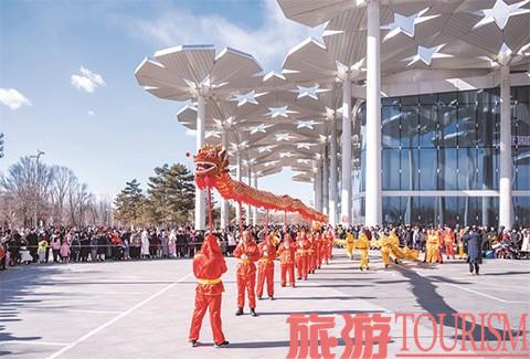 晨光初露,来自各乡镇的花会队伍已浩浩荡荡集结。穿过挂满红灯笼的步道,中国馆广场上的两条金龙已蓄势待发。龙头缀着鎏金饰件,鳞片在阳光下闪烁,随着领珠人的手势猛然腾起,龙身蜿蜒盘旋,时而昂首摆尾如腾云驾雾,时而俯身探爪似戏水追波。鼓手们鼓点密集如惊雷,围观游客的欢呼声与鼓点交织,瞬间点燃了节日的氛围。不远处,国家级非遗延庆旱船队伍缓缓入场,“船姑娘”身着水袖长裙,随着“船身”摇曳轻盈转身,身旁的“艄公”甩着草帽打趣,夸张的动作引得孩童们追着队伍欢笑,活灵活现的演绎,恰似一幅流动的民俗画卷。